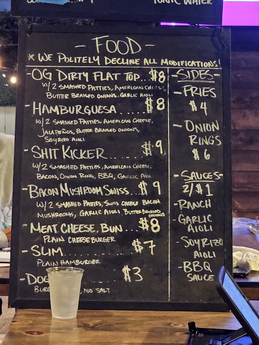 The menu features a variety of hamburger options, including several signature burgers such as the Og Dirty Flat Top Cheeseburger and the Hamburguesa Especial. Alongside the main burger offerings, there are traditional sides like French fries and fresh onion rings available to complement the meals.